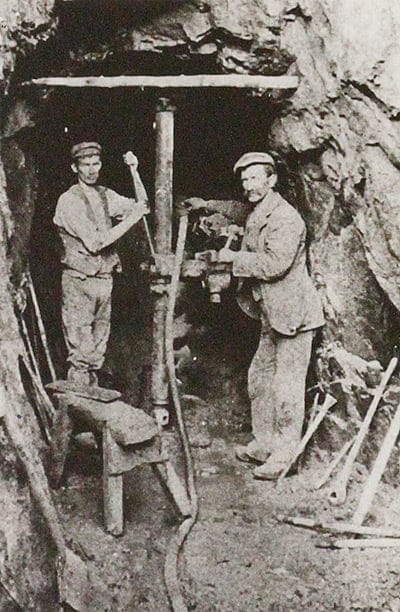 Gwynfynydd was worked from a number of different levels, with access into the mountain by horizontal tunnels (adits). Miners laboured by candlelight. In the early days, shotholes were drilled by hand, using a hammer and steel drill, charged with explosives and blasted. By the end of the century, compressed air drills and other tools were becoming available. Ore extraction (stoping) was carried out both overhand and underhand. In overhand stopes, broken rock accumulated to provide a working platform. Underhand stopes were roofed with timber. The ore was hauled to the surface in wagons on narrow-gauge rails.